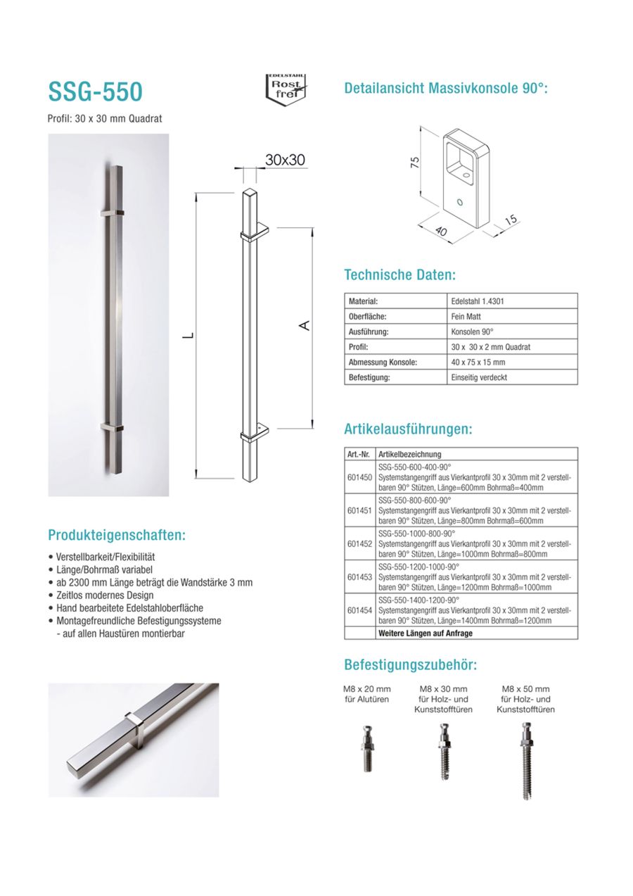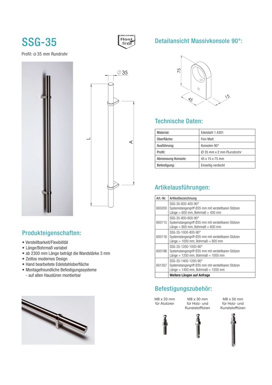| Produkteigenschaften | • Verstellbarkeit/Flexibilität • Länge/Bohrmaß variabel • ab 2300 mm Länge beträgt die Wandstärke 3 mm • Zeitlos modernes Design • Hand bearbeitete Edelstahloberfläche • Montagefreundliche Befestigungssysteme – auf allen Haustüren montierbar |