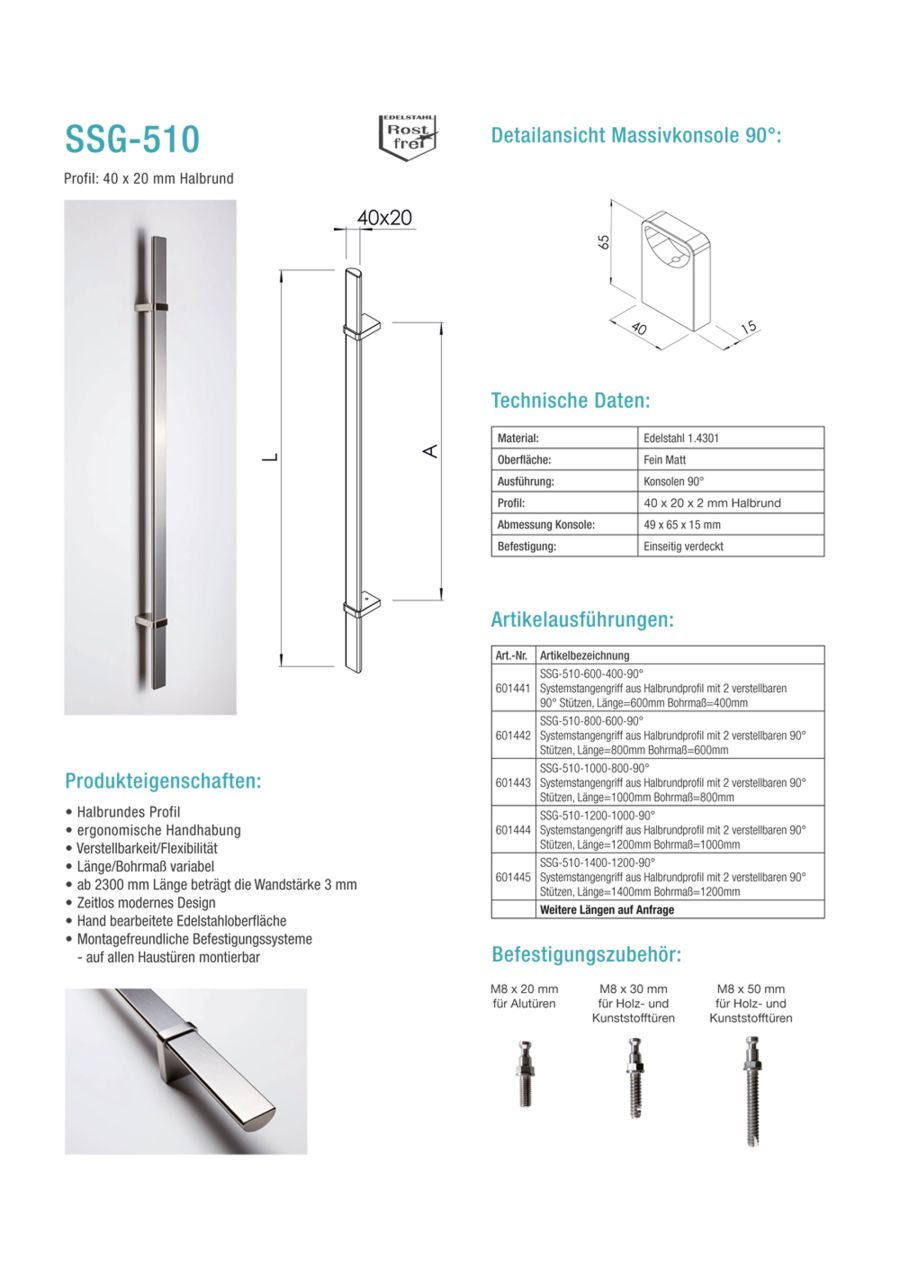 | Produkteigenschaften | • Halbrundes Profil • ergonomische Handhabung • Verstellbarkeit/Flexibilität • Länge/Bohrmaß variabel • ab 2300 mm Länge beträgt die Wandstärke 3 mm • Zeitlos modernes Design • Hand bearbeitete Edelstahloberfläche • Montagefreundliche Befestigungssysteme – auf allen Haustüren montierbar |